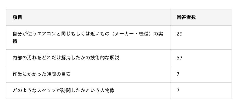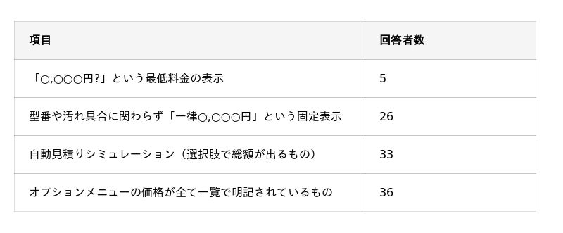 - エアコンクリーニング業者のWebサイト訪問時、最も早く見たいと思われているのは「料金体系」についてで、「オプションメニュー一覧表示」や「自動見積もりシミュレーション」の機能が信頼を集めている。