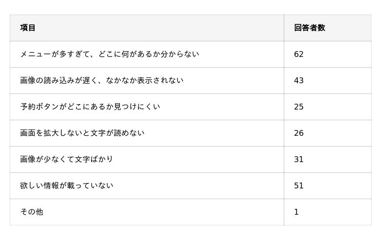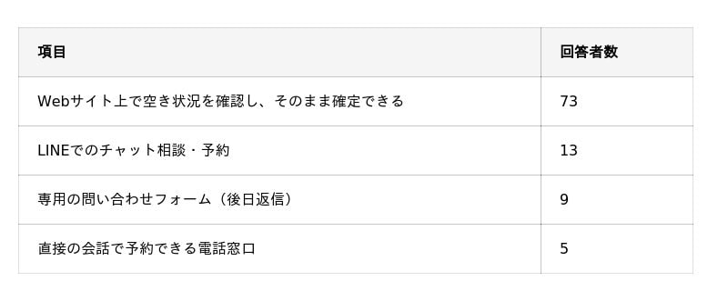 - 予約においては「Webサイト上で空き状況を確認し、そのまま予約確定できる」ちったWebサイト内だけで完結するシステムが最も求められている。