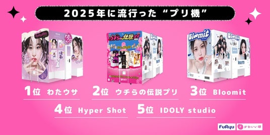 2024年に登場し根強い人気の『わたウサ』がランキング1位に登場。瞳に月型キャッチライトが入ることが特徴で、「盛れる」と令和女子の心を掴んでいます。2位には、2025年12月の登場直後から大きな話題となり一気に人気が広まった『DEAR 令和&平成 ウチらの伝説プリ』がランクイン。平成・令和の“伝説のプリ機”が復活するプリ30周年を記念した特別企画で、平成にプリを楽しんでいた世代や平成レトロを愛する令和世代が行列を作って撮影を楽しんでいます。3位には程よい加工でナチュラルな盛れ感が叶う『Bloomit』がランクイン。4位にはハイアングルショットが撮影でき、好みの盛れ度が選べる『Hyper Shot』、5位には背景カラーや撮影アイテムを自由に選べてセルフ写真館のような楽しみ方ができる『IDOLY studio』 が続きました。
