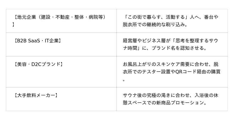 ◆シニアから若年層まで、スマホを介さないリーチ: デジタル広告が届きにくい層や、スマホを置いてリラックスしている高感度なサウナ層に対し、フラットな状態で情報を届けることが可能です。