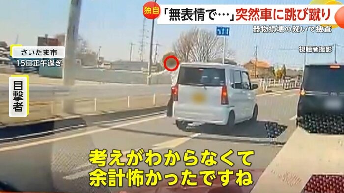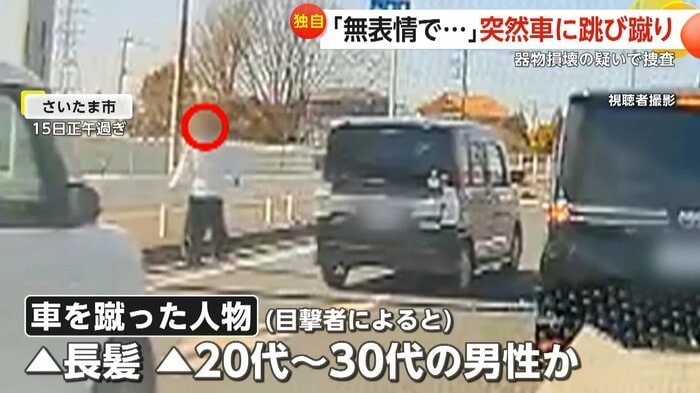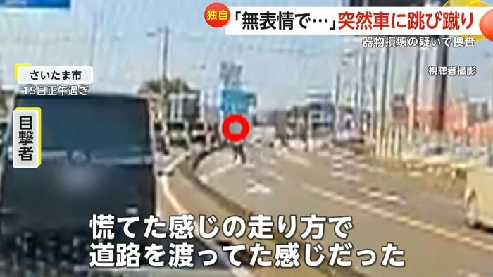 さいたま市の国道で15日、男が走行中の車に跳び蹴りをする瞬間をドライブレコーダーが捉えた。男は中央分離帯を飛び越えて道路に飛び出すと、急ブレーキをかけた車の後ろの白い車に蹴りを入れた。警察が器物損壊の疑いで捜査している。