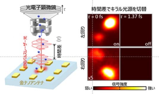 図. 時間差で「キラルな光源」を超高速に切替。単一の金ナノアンテナに、同じ超短パルス光を2本に分けて照射し、2つの光の到達時間差を変えるだけで、ナノスケールの一点に生まれるキラルな光(左回り/右回り)をON/OFF・切り替えできることを示す概念図。