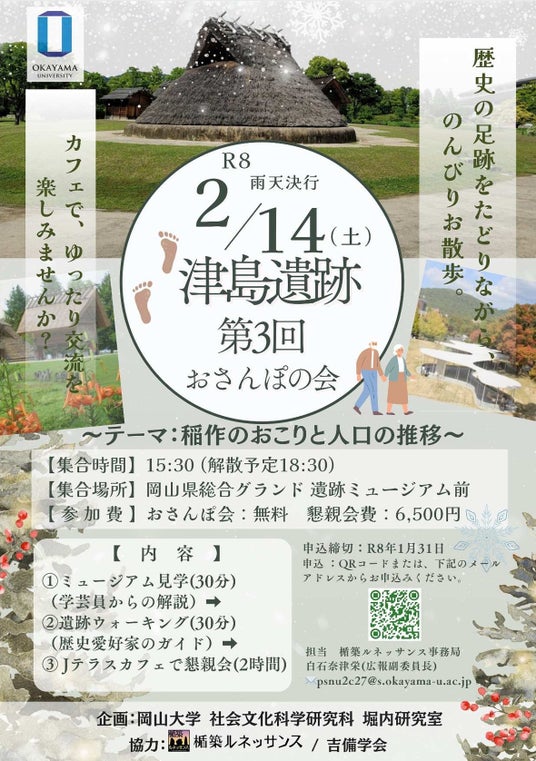 国立大学法人岡山大学(本部:岡山市北区、学長:那須保友)は、2026年2月14日、岡山県総合グラウンド津島遺跡エリア(遺跡&スポーツミュージアム周辺 ~ 岡山大学津島キャンパス ~ Jテラスカフェ)にて、地域文化資源を生かした学習機会の創出を目的として、「吉備路お散歩会(津島遺跡エリア)」を開催しました。教職員・学生・地域の方など、約25人が参加しました。