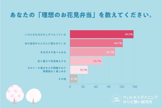 一方で、理想のお花見弁当については「旬の食材がふんだんに使われている」(40.7%)、「いろんなものが少しずつ入っている」(49.0%)と回答した人も多く、約4割が"健康やバランス"を意識していることが明らかになりました。
