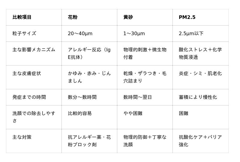 花粉・黄砂・PM2.5が肌に与える影響はそれぞれ異なります。花粉は主にIgE抗体を介したアレルギー反応を引き起こし、かゆみや赤み、じんましん様の症状を生じます。一方、黄砂は物理的な刺激に加え、カビや細菌などの微生物が付着しているため、毛穴の詰まりや二次感染のリスクがあります。PM2.5は粒子が非常に小さく毛穴に入り込みやすいうえ、重金属や有機化合物を含むため、酸化ストレスによる肌老化や慢性的な炎症を引き起こします。