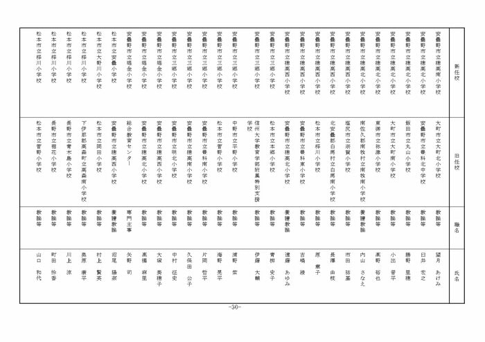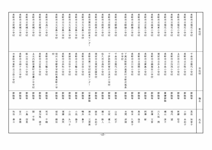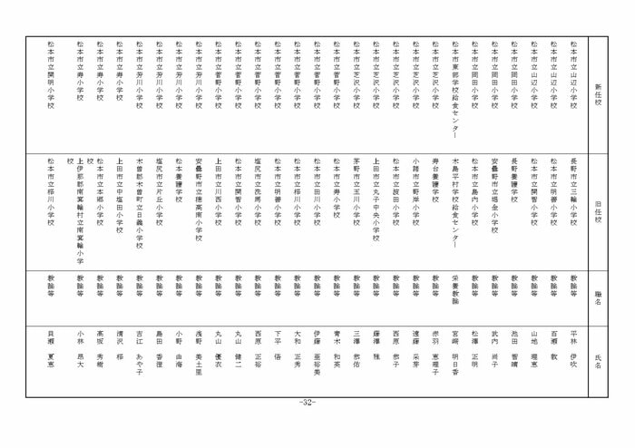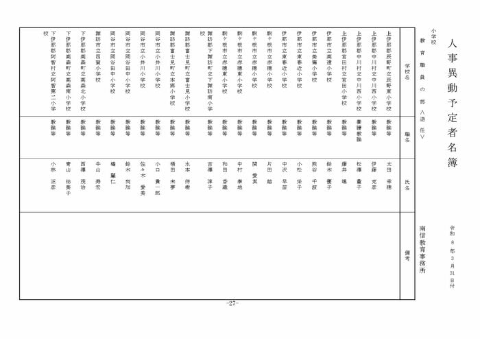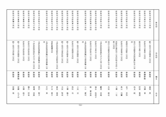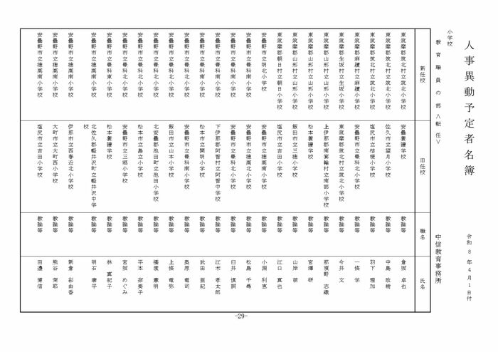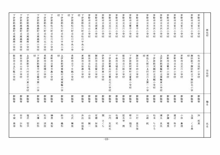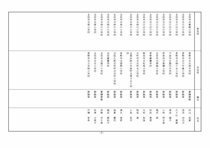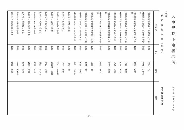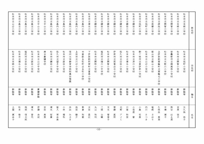 ここでは公立小学校の教諭他の人事を掲載する。(表は長野県教育委員会の発表)