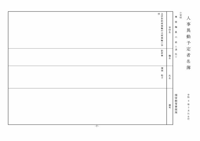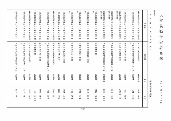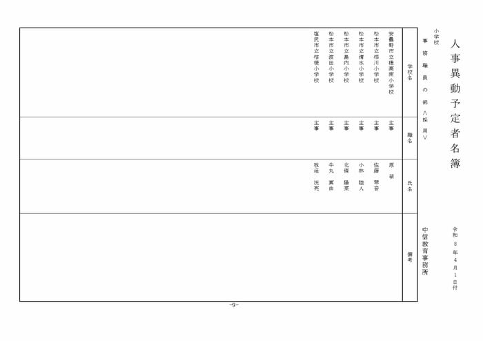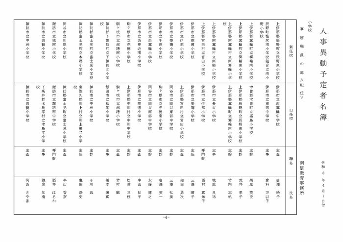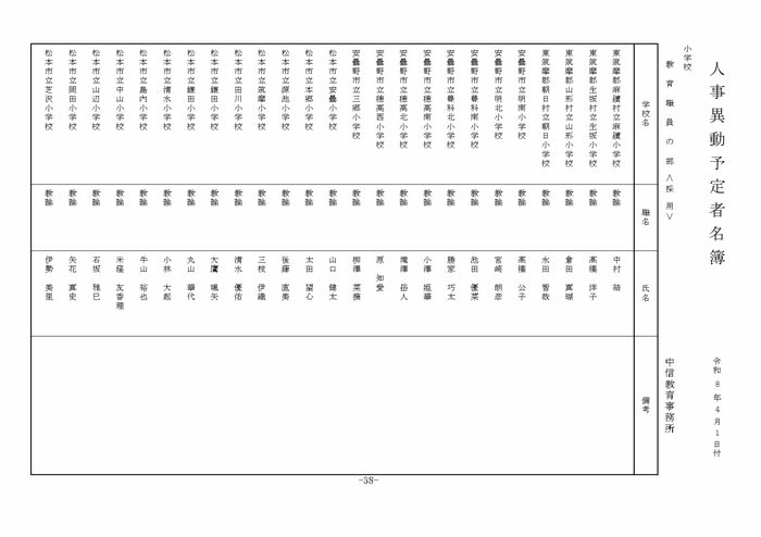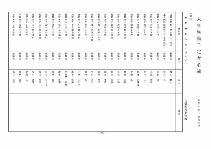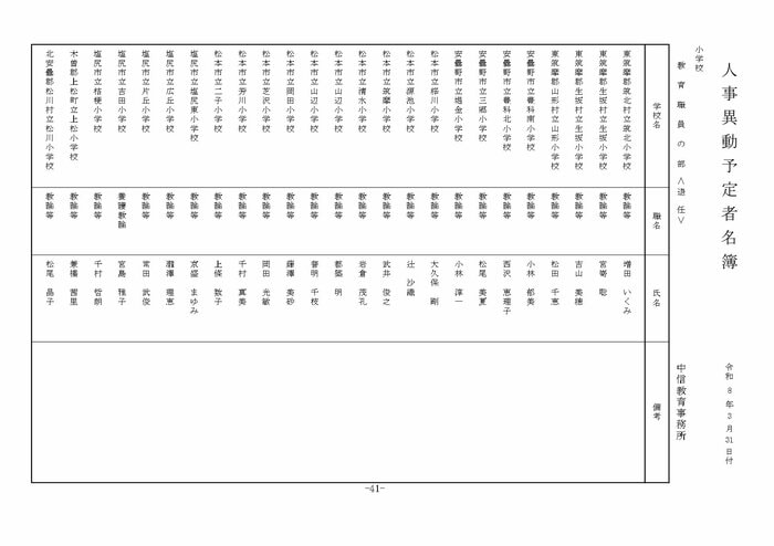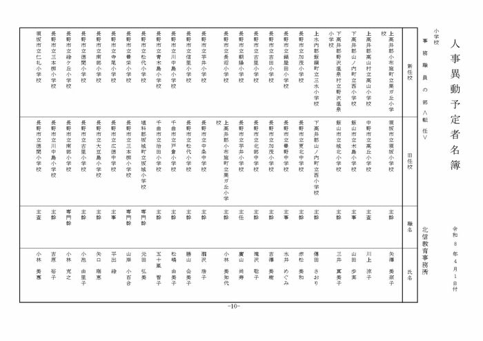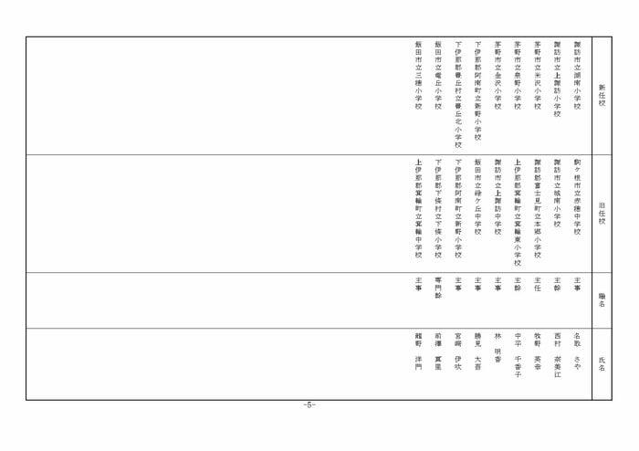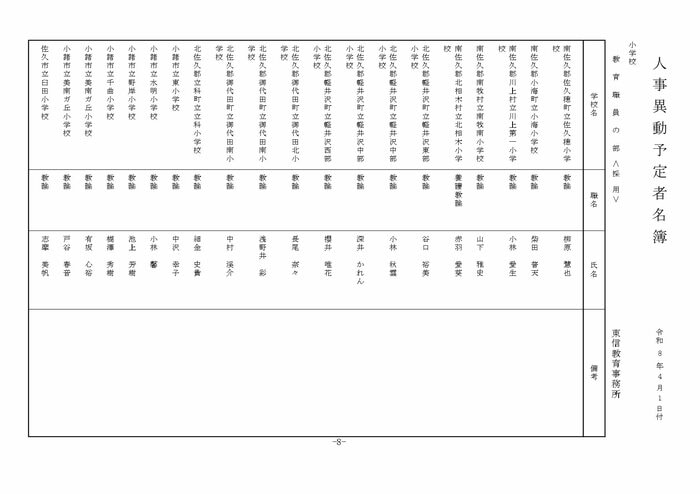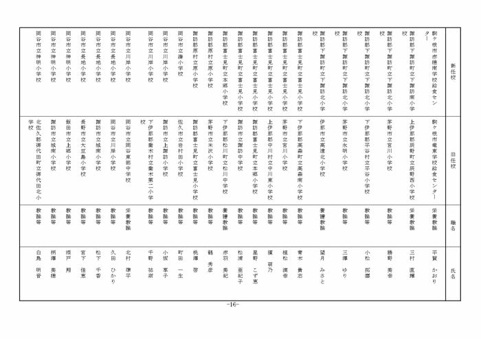 ここでは公立小学校の教諭他の人事を掲載する。(表は長野県教育委員会の発表)