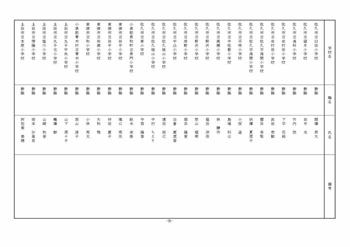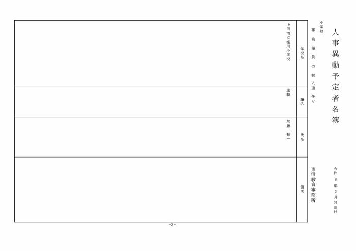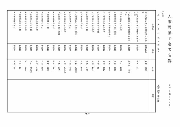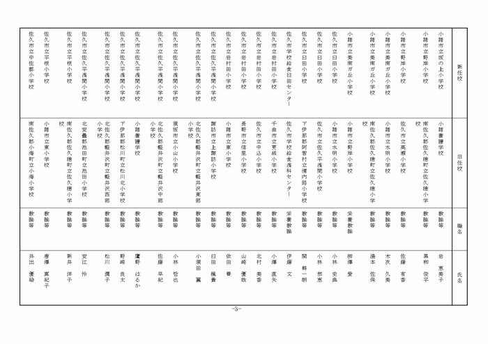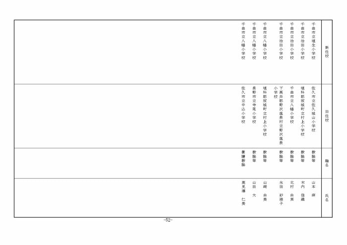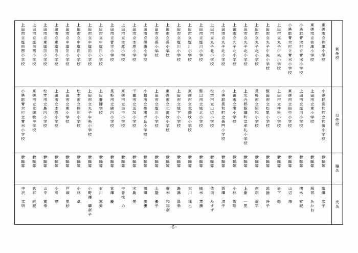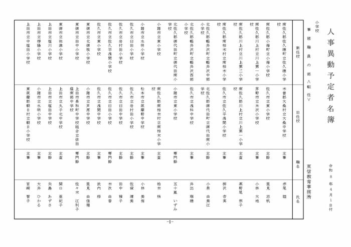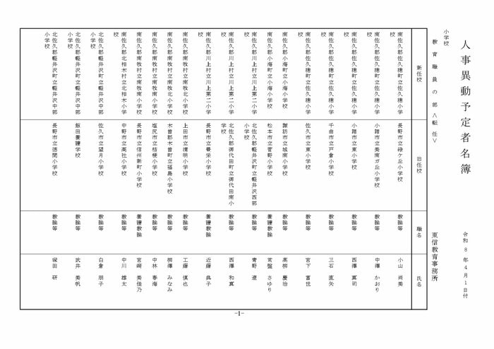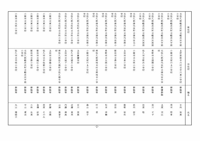 東信地域の小学校へ異動する教諭等は以下の通り。