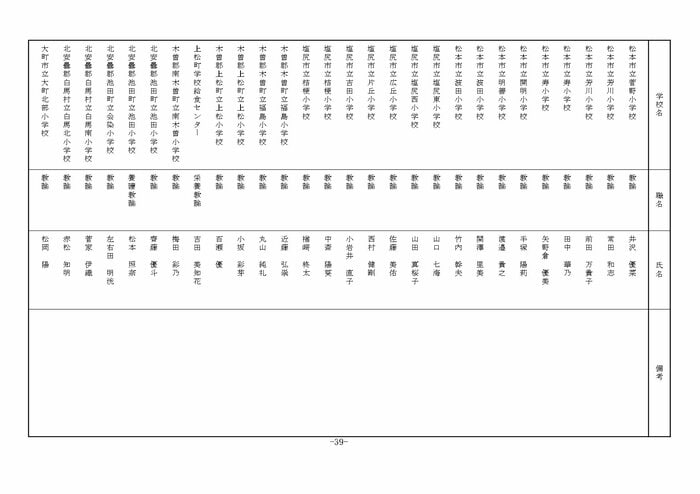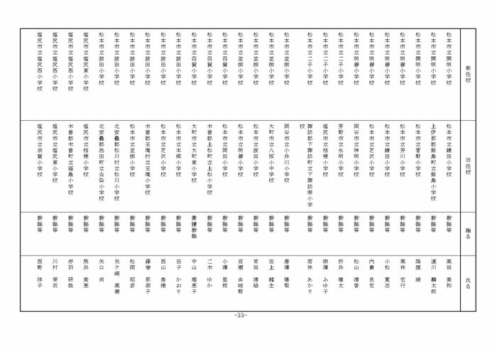 中信地域の小学校へ異動する教諭等は以下の通り。