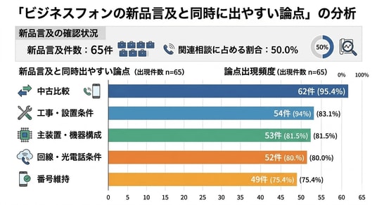 調査では、ビジネスフォン関連相談のうち、「新品」に関する言及が65件確認され、関連相談の50.0%を占めました。同時に、中古比較、工事・設置条件、主装置、回線・光電話条件、番号維持といった周辺論点も高頻度で確認されました。