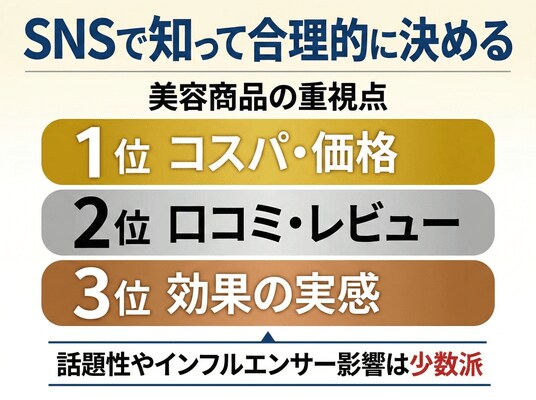 Z世代はSNSネイティブであり、美容商品の認知・発見においてSNSが強い影響を持つことは確かです。ただし、今回の調査では、最終的な購買判断の軸はむしろかなり現実的でした。 美容商品の重視点として上位に挙がったのは、 1位:コスパ・価格 2位:口コミ・レビュー 3位:効果の実感 でした。 これは、Z世代が感覚だけで買っているわけではなく、SNSで知ったあとに、価格・他者評価・自分への効きそうかどうかで冷静に判断していることを示しています。