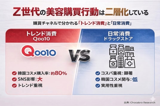 これは、トレンドが広く浸透しているのではなく、特定の層に強く刺さり、その他には届いていない状態とも言えます。 さらに重要なのは、SNSと購買意思決定の関係です。Z世代はSNSネイティブでありながら、最終的に重視するのはコスパ・口コミ・効果実感といった現実的な要素でした。つまり、SNSはあくまで“認知の装置”であり、“意思決定の装置”ではないという構造です。 加えて、購買チャネルの観点では、Qoo10を中心としたトレンド消費と、ドラッグストアを中心とした日常消費という二層構造が見られました。これは、同じ消費者の中でも、“試すための消費”と“続けるための消費”が明確に分かれている可能性を示しています。 これらを統合すると、Z世代の美容購買行動は、