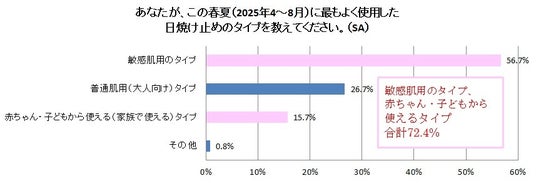 また実際に、この春夏に最もよく使用した日焼け止めのタイプを聞いたところ、2人に1人は「敏感肌用のタイプ」を選んでいることがわかりました。また、敏感肌の大人の約16%が「赤ちゃん・子どもから使える(家族で使える)タイプ」をあえて選んでいることがわかりました。全体でみると約7割の人が「普通肌用(大人向け)タイプ」以外の製品を選択しています。