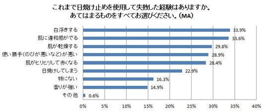 - 日焼け止めを使用して失敗した理由の第1位は「白浮き」。「肌の違和感」や「乾燥」を感じる人も。