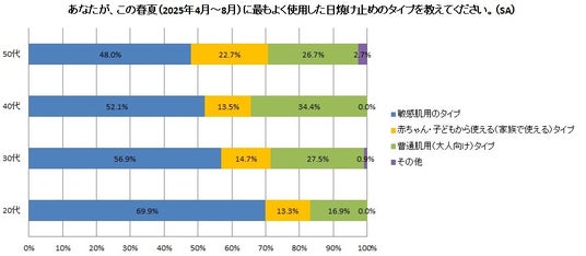 年齢別にみると、20代が「敏感肌用のタイプ」を選んでいる割合が高くなっています。一方、「赤ちゃん・子どもから使えるタイプ」を選んでいる割合は50代が最も多く、家族と一緒に使用できる製品を選んでいることが伺えます。