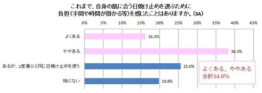 日焼け止めを選ぶために負担を感じたことがあるかを聞いたところ、「よくある」「ややある」とあわせると54.6%と半数以上の人が負担を感じていることがわかりました。また25.6%の人は、「負担があっても一度選ぶと同じ日焼け止めを使う」と回答しており、調査結果1でもあった通り、自分に合った製品を探すことは難しいことが伺えます。