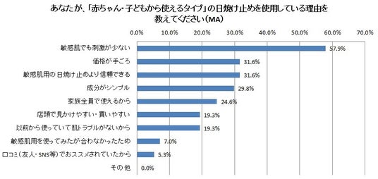 - 「赤ちゃん・子どもから使えるタイプ」の日焼け止めを使用する理由の1位は「敏感肌でも刺激が少ない」。
