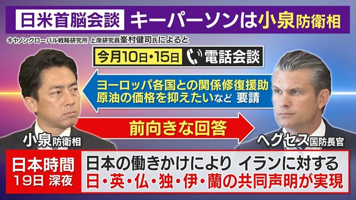 求めとしては「今アメリカはかなり困った状況にある」と、かなり原油も高騰し国際的にも孤立していると。トランプ大統領自体もすねたようなコメントをしたという中で、小泉氏に何を頼んだかというと、「ぜひヨーロッパ諸国とまとめてほしい」「首脳会談ではあまり個別の具体的な、どういう艦船を出してくれなどは言わないから、前向きなメッセージは出してほしい」ということで。為替相場、原油市場も安定させる、共同声明もまとめるという所に動いたと。