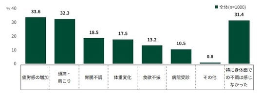 具体的には、「疲労感の増加」が33.6%で最も多く、病院を受診した方が10.5%に及ぶなど、負担の大きさが伺えます。