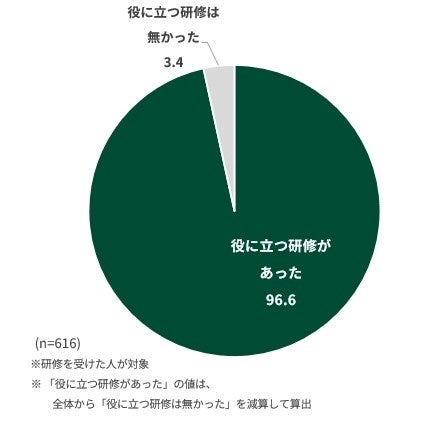 環境変化の前後に会社からのサポートとして何らかの研修を受講した人のうち、96.6%が「役に立った研修があった」と回答しました。変化への適応において、研修が重要な役割を果たしていることが明らかになりました。