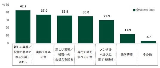 環境変化の前後に、どんな研修やサポートが必要だったかを聞く設問では、「新しい業務/役職の基本となる知識・スキル」42.7%、「実務スキル研修」37%と、実際の業務に直結する知識やスキルが必要とされていることが分かりました。