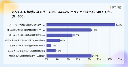 ネタバレに敏感になるゲームの特徴については、「ストーリーや演出を重視しているゲーム」が32.7%で最多となりました。