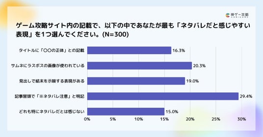 ゲーム攻略サイト内の記載で、最も「ネタバレだと感じやすい表現」を1つ選んでもらったところ、「記事冒頭で『※ネタバレ注意』と明記されている」が29.4%で最多となりました。