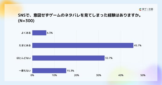 SNSで意図せずゲームのネタバレを見てしまった経験について尋ねたところ、「よくある(6.3%)」、「たまにある(45.7%)」を合わせて52%がネタバレを見た経験があると回答しました。
