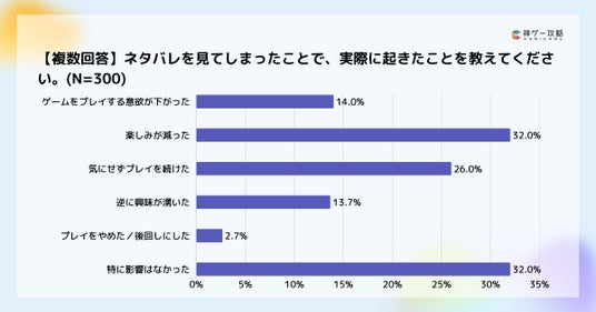 ネタバレを見てしまったことで実際に起きた変化については、「楽しみが減った」が32%で最多となりました。一方、「特に影響はなかった」も32%と同率で並び、「気にせずプレイを続けた」は26%でした。