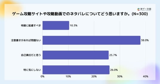 ゲーム攻略サイトや攻略動画でのネタバレについては、「注意書きがあれば問題ない」が38%で最多となりました。