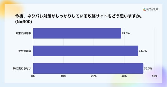 ネタバレ対策がしっかりしている攻略サイトについてどう思うかを聞いたところ、「非常に好印象(29%)」、「やや好印象(34.7%)」を合わせて63.7%が肯定的な評価を示しました。