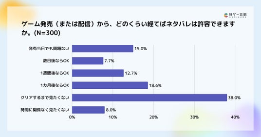 ゲーム発売(または配信)からどのくらい経てばネタバレを許容できるかについては、「クリアするまで見たくない」が38%で最多となりました。