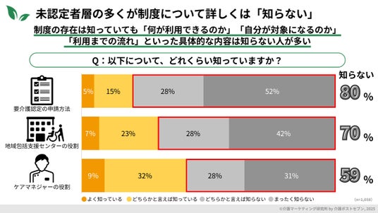 要介護認定を受けた経験がない1,058名を対象に、「要介護認定の申請方法」「地域包括支援センターの役割」「ケアマネジャーの役割」それぞれの認知度を調査したところ、すべての項目で「知らない」が半数を超えるという、周知が不足している厳しい状況が示されました。