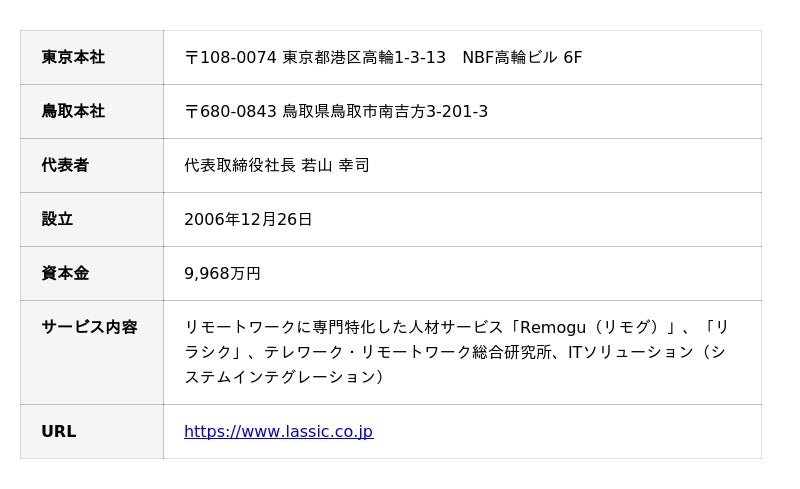 LASSICは2006年に鳥取県で創業し、『リモート社会をリードし、ボーダレスワークの実現によって社会に貢献する。』をビジョンに、「採用」「DX」分野においてボーダレスを促進させる仕組みづくりに邁進し、事業として社会貢献活動をしている企業です。