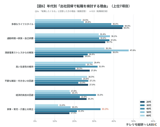 40代では「家事や育児、介護との両立が難しくなるから」が33.3%で全年代中最も高く、3番目に多い回答となった(他の世代では6位以下)。