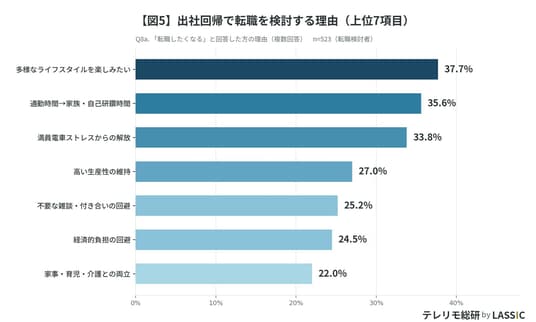 - 会社の出社回帰で転職を検討する理由(n=523、複数回答):1位「多様なライフスタイルを楽しみたい」37.7%、2位「通勤時間を家族・自己研鑽に」35.6%、3位「満員電車ストレスからの解放」33.8%