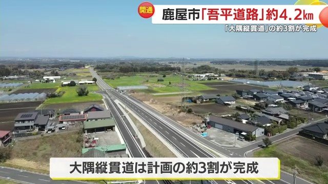 鹿児島県鹿屋市の吾平町を通る「吾平道路」が3月20日、開通した。大隅半島を南北に縦断する「大隅縦貫道」の一部であり、今回の開通により計画全体の約3割が完成したことになる。塩田知事は「一刻も早く全線開通を目指して全力で取り組む」と意気込みを語った。