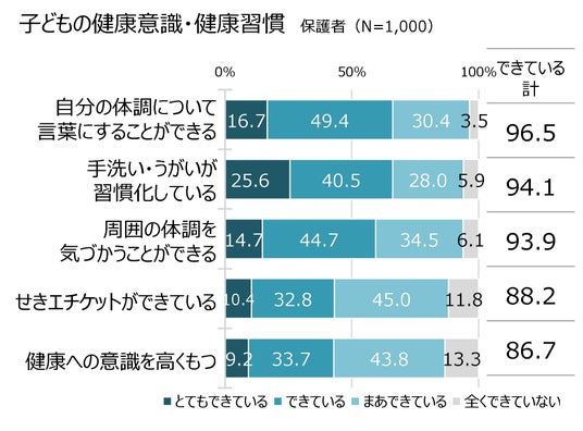 次に子どもの健康意識・健康習慣について、保護者を対象に「できているかどうか」を4段階で調査しました(とてもできている/できている/まあできている/全くできていない)。「とてもできている」「できている」「まあできている」を合算した結果、94.1%が「手洗い・うがいが習慣化している」と回答し、9割以上の子どもが手洗い・うがいの習慣を身につけていることが明らかになりました。また自身の体調管理にとどまらず、93.9%が「周囲の体調を気づかうことができている」、88.2%が「せきエチケットができている」と回答するなど、他者への配慮を含めた健康行動も高い水準にあります。