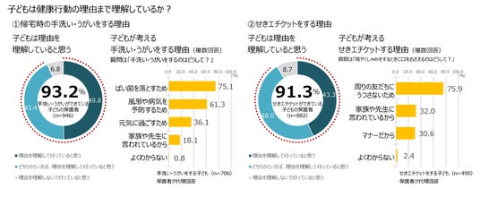 ●保護者の93.2%が「子どもは手洗い・うがいをする理由を理解している」と回答。子どもに手洗い・うがいをする理由を聞くと、75.1%が「ばい菌を落とすため」、61.3%が「風邪や病気を予防するため」と回答。