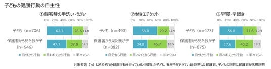 ●「帰宅時の手洗い・うがい」だけでなく、「早寝・早起き」や「せきエチケット」も子どもは能動的に行動。