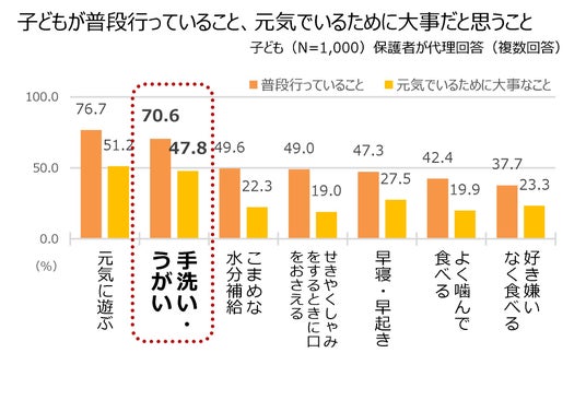 そこで、子ども自身に普段行っていることを聞くと、70.6%が「手洗い・うがい」を実践し、自分が元気でいるために大事なこととして約半数が「手洗い・うがい」(47.8%)を挙げました[図3]。
