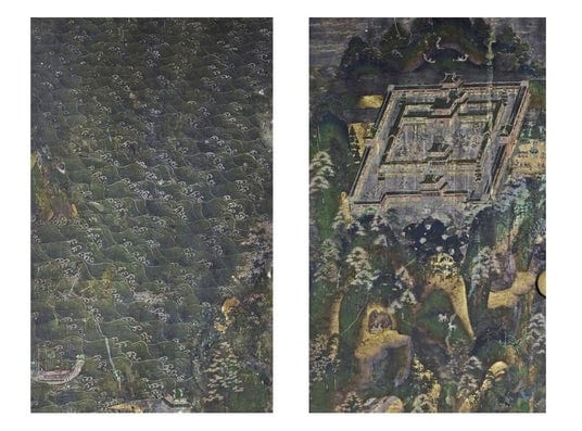 坂井市の大善寺に所蔵される「木造黒漆塗厨子」の正面に向かって左右扉絵に描かれた補陀落山(ふだらくせん)の厨子絵。写真右が観音菩薩の住まいとなる宮殿部分(拡大部)。建物の上、宙に舞う天女が見える。写真左は補陀落山の対岸の大海原。特に海原の波模様の美しさが目を引く。