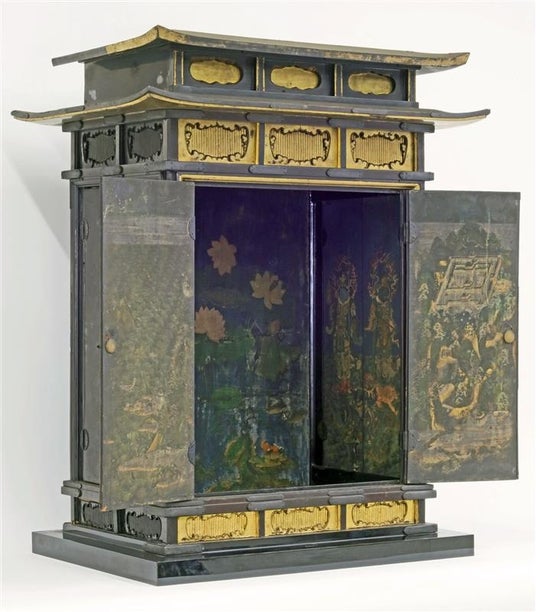 「700年以上前の彩色美が感じられ、その緻密さは一級品の仏教絵画」と同館の大廣克也学芸員も“必見の品”と語る。厨子は高さ約120cm、幅約70cm、奥行約50cm。内部に描かれた厨子絵は、扉を開いた状態で向かって正面左に「大海原」、正面右に観音様が住まう宮殿がある「補陀落山(ふだらくせん)」。奥壁の背景には美しい花を付けた「蓮池」が神秘的に描かれる。さらに両側面には、仏法を守護する「四天王像」が描かれ、向かって左に「増長天」と「広目天」、右に「持国天」と「多聞天」が並ぶ。いずれも海中の岩座上で邪鬼を踏んで立ち、その傍らには持物を捧げ持つ一人の鬼神が立っている。
