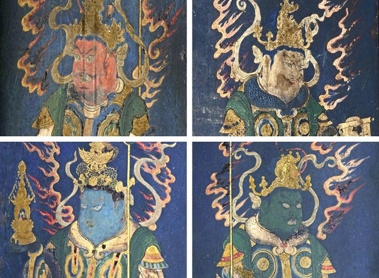 厨子の側面に描かれた四天王像。「増長天」(写真左上)、「広目天」(写真右上)、「多聞天」(写真左下)、「持国天」(写真右下)。いずれも彩色鮮やかだ。