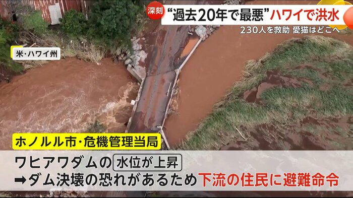 アメリカ・ハワイ州で、過去20年で最大規模の洪水が発生した。ホノルル市の危機管理当局は、オアフ島北部にあるダムが決壊する恐れがあるとして、下流の住民に避難命令を出した。