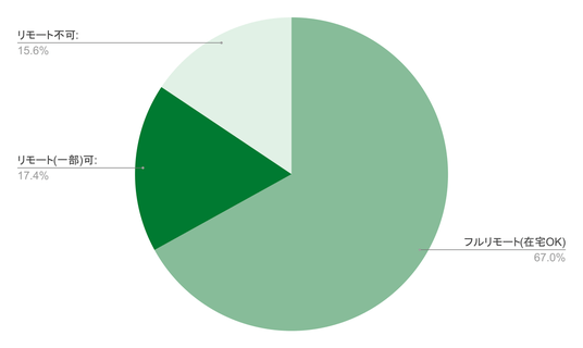 フルリモート対応が62.7%と約6割を占め、一部リモート可を含めると96%以上がリモートワークに対応しています。SEO業務はデータ分析やコンテンツ企画、レポート作成が中心のため、場所を選ばず進められる作業がほとんどです。稼働日数も週2~3日が最多と柔軟性が高く、時間と場所の両面で自由度のある働き方が実現しやすい職種です。