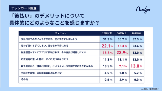 - 一方で、「支払いを翌月に遅らせる」というメリットは、一部のユーザーにとってはデメリットとして機能している側面も明らかになりました。具体的には、後払いのデメリットとして、「支払日までのタイムラグがあり、使いすぎてしまいそう」という回答が全世代で最多となり、後払いが一概にメリットとしてのみ受け入れられているわけではない様子が伺えます。