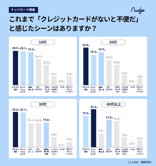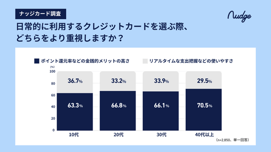 ナッジ株式会社(本社:東京都千代田区、代表取締役:沖田 貴史)は、次世代クレジットカード「Nudge(ナッジ、以下「ナッジカード」)の利用者2,850名(18歳以上の成人)を対象に、キャッシュレス決済の利用実態に関する調査を実施しました。