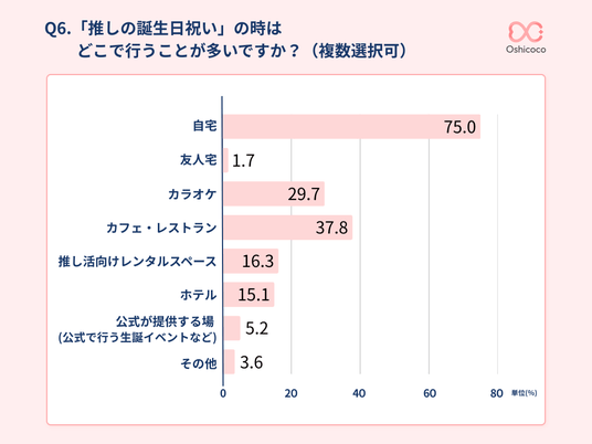 誕生日祝いで最もお金をかけるものとして、「公式グッズ」が48.5%で、約2人に1人が回答する結果に。次いで「食べ物(ケーキ・カフェ代など)」が30.2%、「場所のレンタル代」が9.5%と続きました。