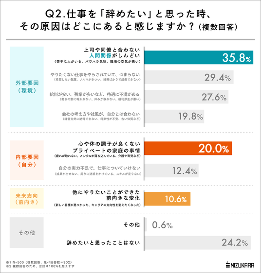 さて、仕事を「辞めたい」と思う原因についても深掘りしていきましょう。圧倒的に多いのは上司や同僚など「人間関係が合わない」という回答で、35.8%にのぼりました。その他も外部要因が多く、転職を検討する動機は基本的に会社や仕事内容への不満が多く、その退避行動として転職する人が多いということがわかります。
